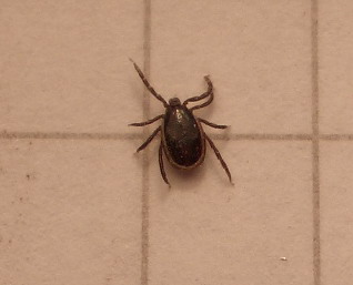 Моей мыльницей крупнее не получается, но все таки удалось клеща сфотографировать, зашел я вечером в хату, сел за комп, а это кровососущее ползало у меня по шее, одного такого же пришлось вырывать с пуза две недели назад, пытался крови напиться.