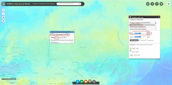 Link: Не забывайте о длительности солнечного дня. Чем севернее от экватора тем день зимой короче, а после некой "черты" и вообще отсутствует. Ну и за облака не стоит забывать. Ну это я всё написал. А по ссылке можно посмотреть сколько реально было солнца в любой точке земного шара, усреднённое за 22 года. Или за конкретный год. С учетом облаков и всего остального. При чем можно смотреть как на поверхность так и перпендикулярно лучам. https://power.larc.nasa.gov/data-access-viewer/ Видно, что в Сибири солнечной энергии больше чем в Европе, так как в Европе облаков много. Вот среднее в день за год (по результатам измеренного за 22 года). Видно, что, практически, почти по всей России больше солнечной энергии чем в Европе. Можно считать, что в среднем за год около 3 кВтч на метр квадратный в сутки или около 1 МВтч на метр квадратный в год. Недостаток в том, что в те месяцы, когда энергии больше всего надо, её меньше всего :) надо летом "солить" энергию на зиму :) Если преобразовывать в электричество, надо учитывать коеф. преобразования солнечной панели, который всего 15-20%. Т.е. с 1 квадратного метра панели получим всего лишь 0.5 кВтч в сутки. Лучше напрямую греть воду там КПД больше 90%. |